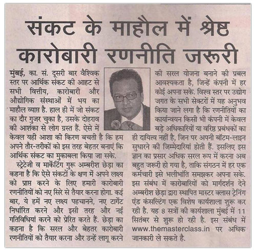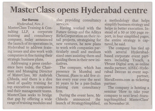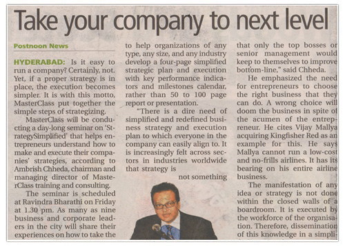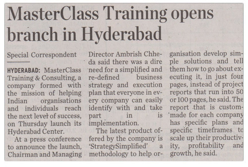 Core Purpose & Mission of MasterClassŪ is 'Nation Building'; by contributing, in our own way, to the economic development of our country by helping tens of thousands of Indian Companies and millions of individuals reach the next level of success. We do this by providing business coaching & mentoring services, execution consulting services, simplified training programs and tools, through various mediums across the country, through professionals with practical industry experience. |