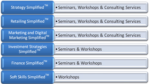 MasterClass® offers Seminars, Workshops & Consulting services such as StrategySimplified ® , Marketing & Digital Marketing Simplified®, RetailingSimplified®; as well as offers Seminars & Workshops on FinanceSimplified®, Investment Strategy Simplified® & SoftSkills Simplified®. The key target audience is Corporate sector, Small & Medium Enterprises, Start-ups, Trade & Industry Associations & Individuals who want to reach the Next Level. |
